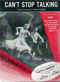 Can't Stop Talking From the film Let's Dance Written by Frank Loesser © 1950 Paramount Music Corp. Released on RCA Victor 20-3908 Recorded August 18, 1950 Running Time: 2 mins 04 secs Lyrics: His eyes, his nose, his fingers, his toes His smile when he says please And when he sneezes, his sneeze His arms, chest, coat, vest His everything is sweeter than sweet I try and try but honest to Pete I can’t stop talkin’ about him And talkin’ about him and talkin’ about him I can’t stop talkin’ about the man that I adore I can’t stop talkin’ about him And talkin’ about him and talkin’ about him I can’t stop talkin’ about him and though I seem a bore I can’t stop tellin’ about him and yellin’ about him And tellin’ about him I can’t stop hollerin’ over the moment that we met He had a pinstriped whatd’yecallit A beautiful smile, a barrel of money I can’t stop talkin’ about him yet He kissed me a bell went “boing” A whistle went “whoo” A trapped door opened and I flipped right through And now I can’t stop talkin’ about him And talkin’ about him and talkin’ about him And if he was yours, well neither would you! Stop talkin’ about him and talkin’ about him, And talkin’ about him and talkin’ about him Until your face turned blue Talkin’ about him and talkin’ about him, Talkin’ about him and talkin’ about him The whole day through |