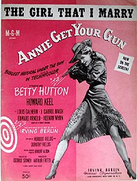 The Girl That I Marry (Reprise) From the film Annie Get Your Gun Written by Irving Berlin © 1946 Irving Berlin Music Co. Released on MGM 30229 Recorded October 8, 1949 MGM Studio Orchestra conducted by Adolph Deutsch Running Time: 1 mins 44 secs Lyrics: The girl that I marry will have to be As soft and as pink as a nursery The girl I call my own Will wear satins and laces and smell of cologne Her nails will be polished And in her hair she'll wear a gardenia He'll be there Instead of flittin', he'll be sittin' Next to her and she'll purr like a kitten A doll he can carry The girl that he marries... |